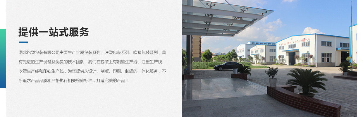 湖北銘塑包裝有限公司一家集研發(fā)、生產(chǎn)、銷售于一體的較優(yōu)秀民營(yíng)企業(yè),技術(shù)力量雄厚,產(chǎn)品質(zhì)量可靠。位于交通暢順,百業(yè)興旺、經(jīng)濟(jì)富裕、政策開放的孝感開發(fā)區(qū)域。我們企業(yè)的營(yíng)銷戰(zhàn)略是以建筑為土壤,以產(chǎn)品為種子,以質(zhì)量為肥料,讓綠色鋪滿全球。憑借多年來(lái)的行業(yè)經(jīng)驗(yàn),公司不斷進(jìn)行創(chuàng)新和研發(fā),為市場(chǎng)提供更廣泛的產(chǎn)品應(yīng)用領(lǐng)域和更好環(huán)保節(jié)能產(chǎn)品,為國(guó)家能源環(huán)保戰(zhàn)略和可持續(xù)發(fā)展戰(zhàn)略作出應(yīng)有的貢獻(xiàn)。     湖北銘塑包裝有限公司主要生產(chǎn)金屬包裝系列、注塑包裝系列、吹塑包裝系列,具有先進(jìn)的生產(chǎn)設(shè)備及優(yōu)良的技術(shù)團(tuán)隊(duì),我們?cè)诎b上有制罐生產(chǎn)線、注塑生產(chǎn)線、吹塑生產(chǎn)線和印鐵生產(chǎn)線,為您提供從設(shè)計(jì)、制版、印刷、制罐的一體化服務(wù),不斷追求產(chǎn)品品質(zhì)和嚴(yán)格執(zhí)行相關(guān)檢驗(yàn)標(biāo)準(zhǔn),打造更好的產(chǎn)品!